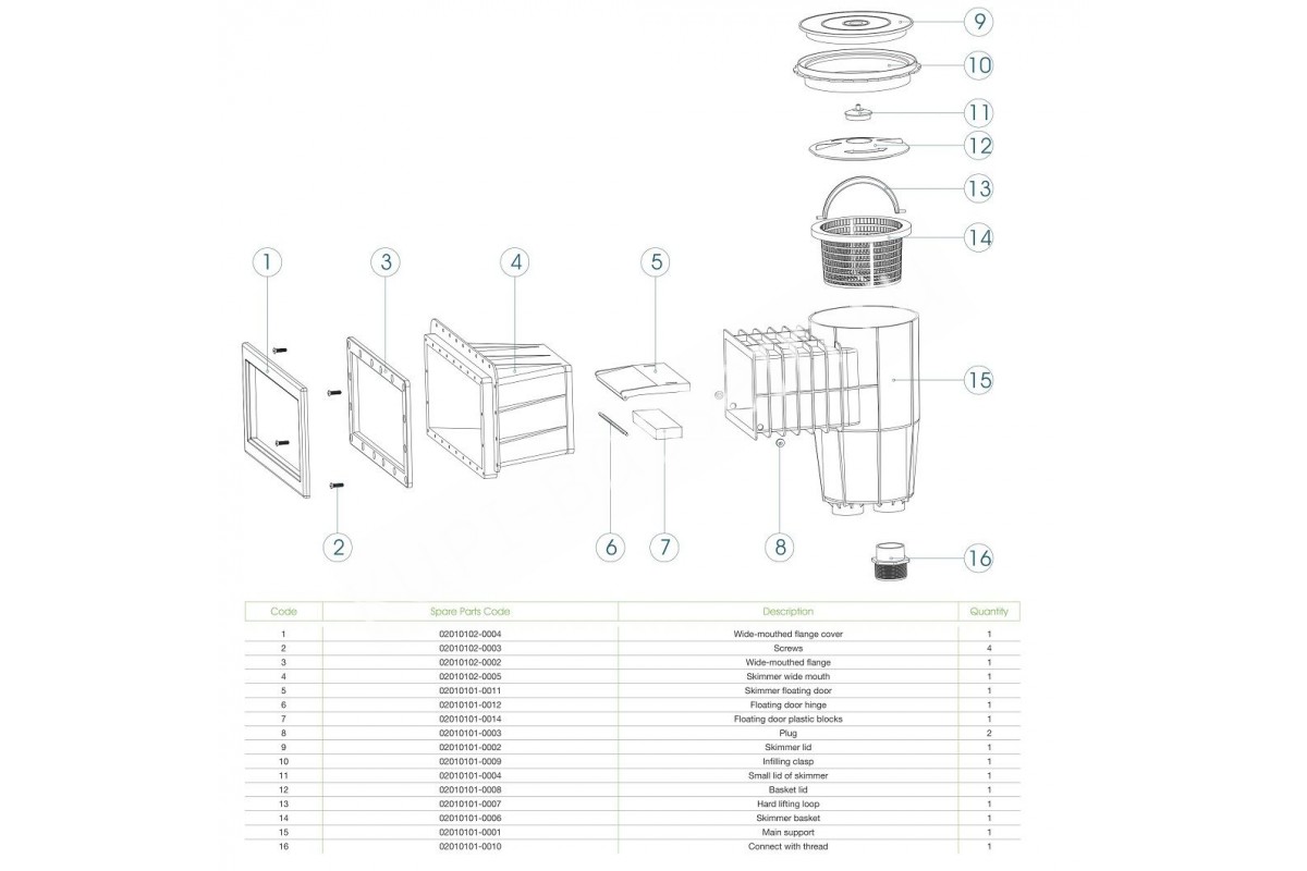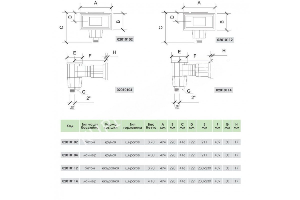 Экстра защита от воздействия ультрафиолетаВысокая сопротивляемость химическим и атмосферным воздействиямКорзина с ручкойCкиммерный сливПлавающая заслонка и регулятор потокаШирокая горловинаКруглая крышкаСоединение внутр. резьб. 1 1/2" / внеш. резьб. 2" или 50 мм под клей