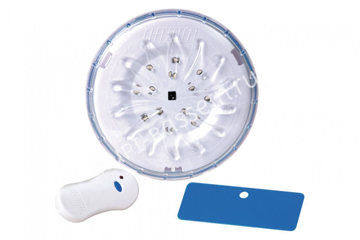 СШАПредназначен для подводной подсветки сборных бассейнов. Устройство крепится на внутреннюю стенку бассейна, в то время как магнит крепится на заднюю стенку. Максимальная толщина стенки бассейна не должна превышать 5 мм. Возможны два режима работы: яркий (13 светодиодов) и приглушенный (5 светодиодов). Управление светильником осуществляется с помощью пульта дистанционного управления (в комплекте). Питание от трех АА батарей (поставляются отдельно) и одной батареи CR2032 для ПДУ (в комплекте). Светильник очень просто устанавливается и снимается без каких-либо инструментов. Пульт дистанционного управления делает управление режимами и включением/выключением светильника максимально легким.