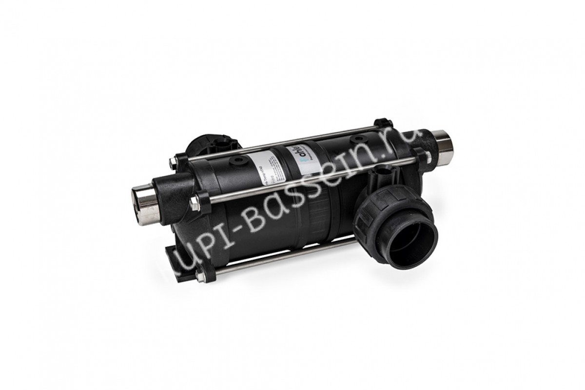 ШвецияПредназначен для нагрева воды и поддержания заданной температуры в бассейне с высоким риском коррозии. Сборный корпус изготовлен из армированного термостойкого пластика высокого качества, стянутого длинными нержавеющими болтами. Спираль изготовлена из кислотостойкой нержавеющей стали AISI-316L. Подходит для любого типа инсталляций (котлы, тепловые насосы, солнечные панели и др.). С помощью насоса фильтрации вода из бассейна попадает в теплообменник. При контакте воды со спиралью происходит передача тепловой энергии. Таким образом вода в бассейне нагревается. Если температура воды становится выше установленного значения на термостате, срабатывает автоматическая блокировка подачи воды в теплообменник.